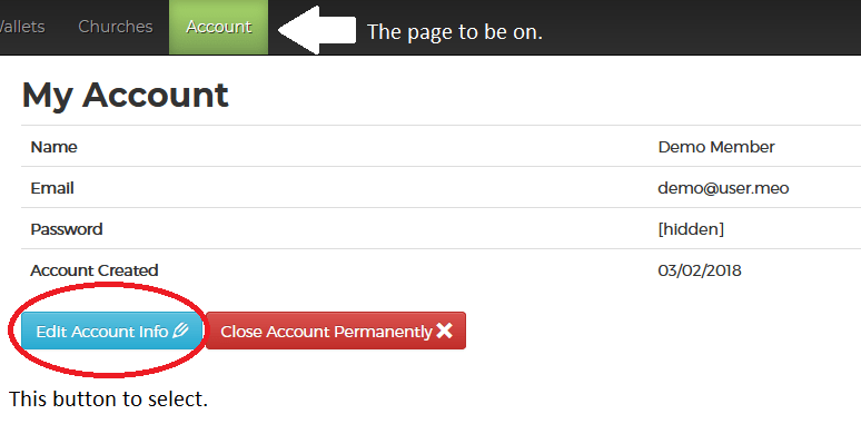 To change your email address, once you’re logged in – go to “Account” at the top of the page, and then select the blue button labeled “Edit Account Info”.